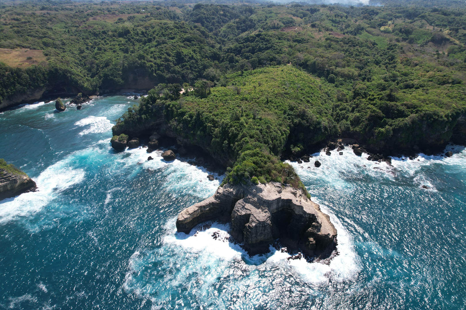 Dramatic coastline of Kabisu land with turquoise waves, hidden coves, and untouched beaches